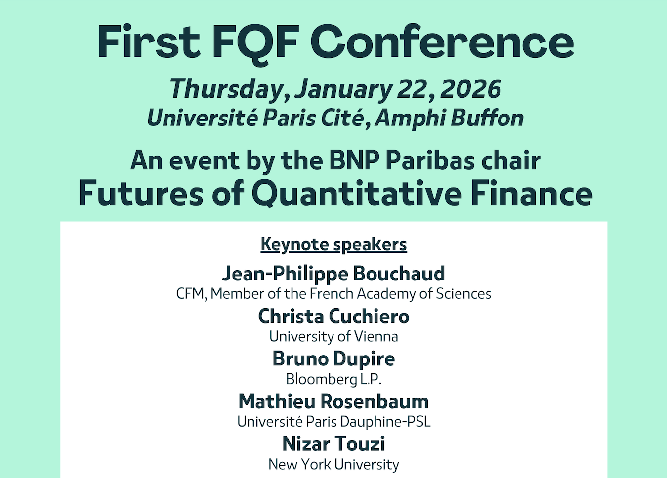 The chair Futures of Quantitative Finance is a partnership between LPSM at Université Paris Cité, CERMICS at École nationale des ponts et chaussées, and BNP Paribas Global Markets. It was launched in March 2023 and is led by Julien Guyon, professor at École nationale des ponts et chaussées, and Stéphane Crépey (succeeding Huyên Pham since July 2024), professor at Université Paris Cité.